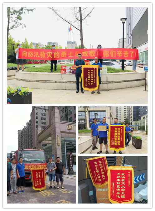 天津俊彦社区文化服务有限公司自7月21日以来,在郑州各个小区组织地下室排水工作24小时不间断轮班制的深水里进行排水作业,各被救援小区居民争相制作锦旗感谢神龙排涝突击队。