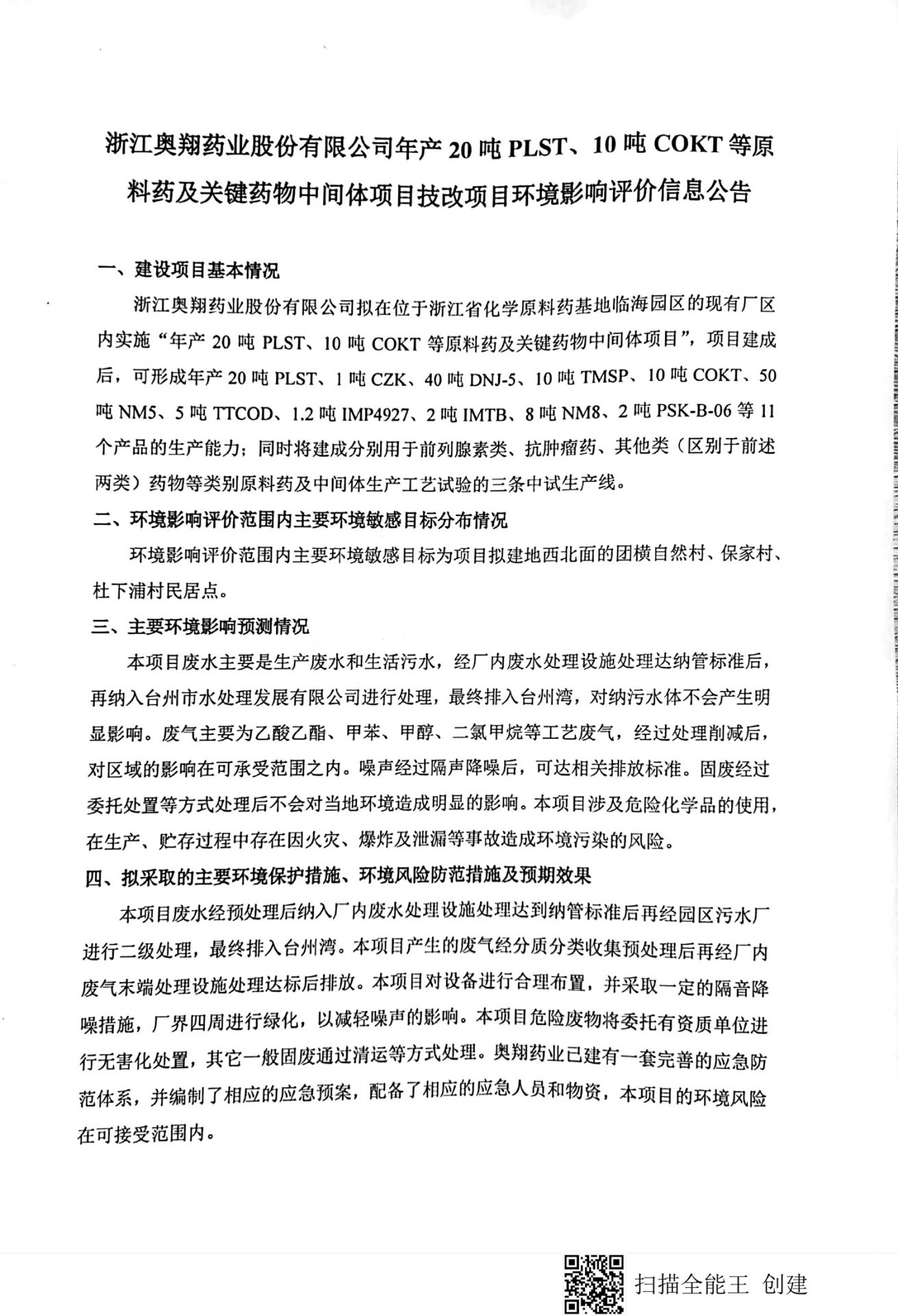 特色原料药及关键中间体产业项目二期技改环评信息公告